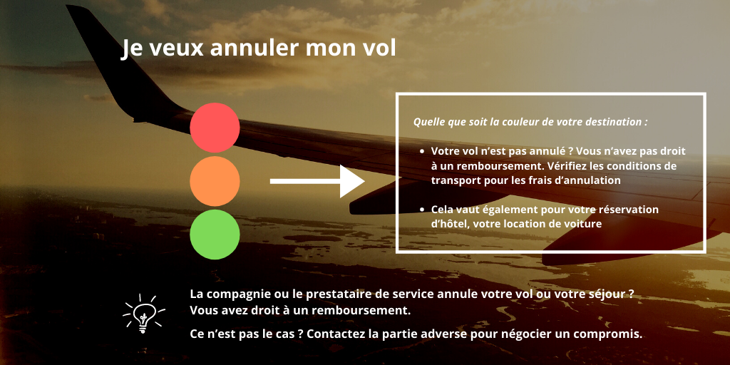 - Le code couleur de ma destination est rouge, orange ou vert et je souhaite annuler mon vol / ma réservation d’hôtel / de voiture de location … Est-ce possible sans frais ?